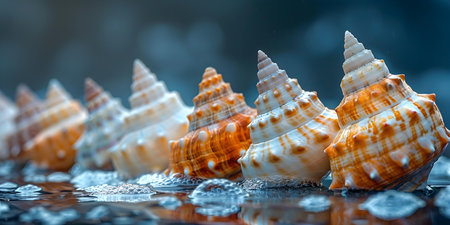 Seashells with smooth textures and gold glitters rest in tranquil waters