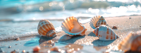 Seashells scattered on a serene beach with soft sand and gentle waves in the background, capturing the peaceful essence of a coastal environment. ideal for themes of relaxation, holidays, and natural beauty.