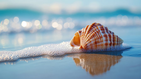 A beautiful close-up of a striped seashell resting on the wet sand at the shoreline, gently lapped by the ocean. The warm, golden light of sunset or sunrise illuminates the shell's intricate patterns and the sparkling grains of sand. This tranquil image evokes peaceful memories of summer vacations and the beach.