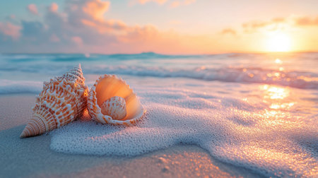 Elegant seashell resting on damp sand at the ocean edge during golden hour sunset. soft light illuminates the intricate patterns of the conch shell, reflecting on the wet beach surface. serene coastal scene symbolizing peace and summer vacation.