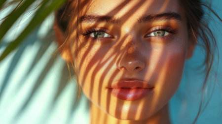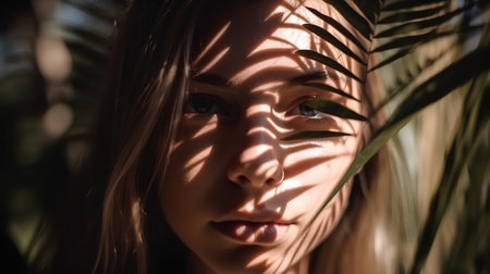 Portrait of a young beautiful woman in the woods, on the face shadow of ferns