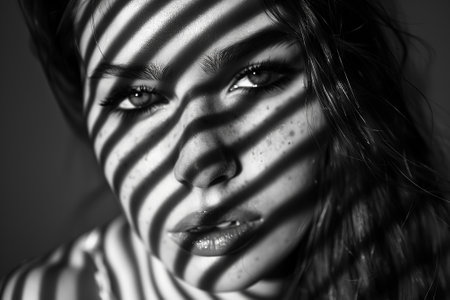 Study in pattern and beauty. Monochrome studio shot of a woman with patterns projected onto her.