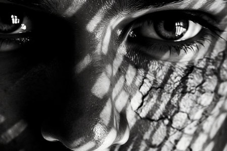 A close-up view of a textured surface with intricate patterns and dramatic shadows.