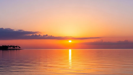 A serene ocean sunset with vibrant orange and pink colors reflecting on calm water, a distant silhouetted island with palm trees.