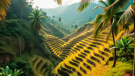 A view of the terraced rice paddies in the mountains, bathed in golden sunlight
