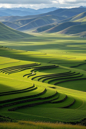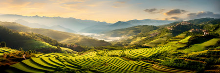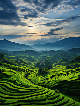 An AI generated illustration of An awe-inspiring landscape view of rolling rice fields