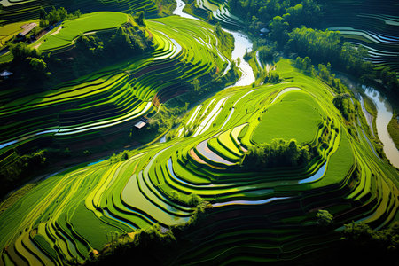 The aerial perspective of terraced rice fields unfolds layers of lush greenery, highlighting agricultural artistry and sustainability.