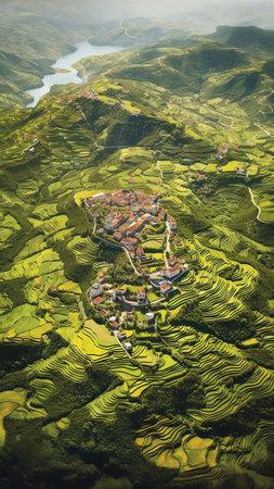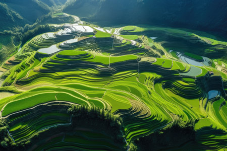 This high-resolution aerial image captures the sublime beauty of terraced rice fields carved into the mountainside. The verdant layers form a complex tapestry of hues ranging from deep emerald to soft sage, outlined by the golden earth. These ancient and sustainable agricultural practices create a breathtaking landscape that is as functional as it is beautiful. This image would be a perfect fit for environmental, agricultural, and cultural narratives, showcasing the harmony between human ingenuity and the natural world.