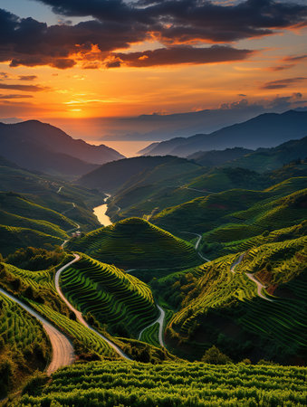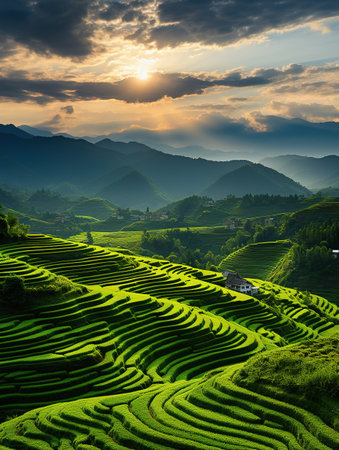 Sunset showing expansive terraced rice paddies reflecting golden sunset light creating a agricultural landscape with rolling hills and mist. resolution