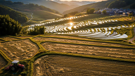 Reflection showing expansive terraced rice paddies reflecting the golden sunset light with a small village nestled in the hills and a red tractor in the foreground...