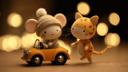 A charming scene shows a cute mouse driving a small orange toy car, while a playful cat walks nearby in a softly lit setting, filled with a warm ambiance.