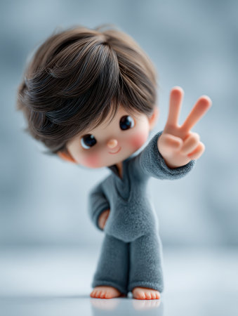 Chibi character is posing in a pastel studio while displaying a peace sign. The scene has soft shadows and a light atmosphere.