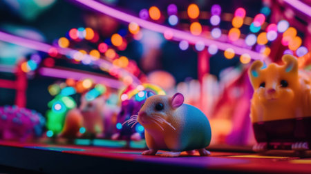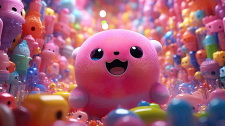 A vibrant display of colorful candy figures and toys, creating a playful and cheerful scene with bright lighting and various shapes.