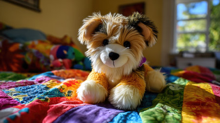 A charming plush toy puppy sits on a vibrant quilt, showcasing a cozy indoor space filled with warm colors and natural light, perfect for playtime.