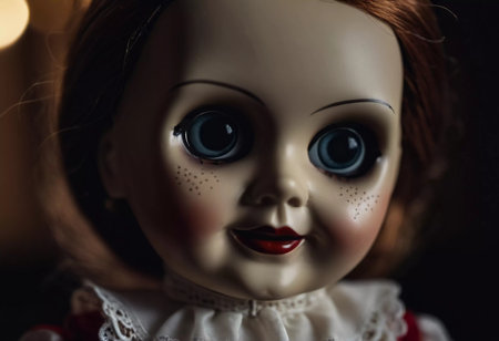 Unsettling doll, featuring dark eyes and red hair, captures attention in a shadowy environment with soft, ambient lighting reflecting an eerie atmosphere. Scary doll for horror and Halloween. AI.