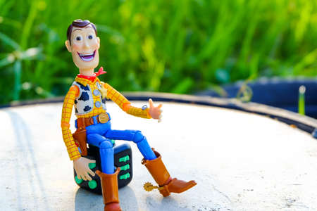 Miniature people : Traveler with backpack hitchhiking Thai farming trucks, Travel and Adventure concepts in Thailand and hitchhiking concept