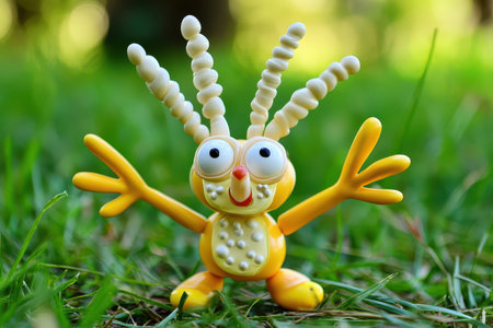 A playful yellow character with quirky features stands with arms wide open on lush green grass showcasing its vibrant design under natural light.