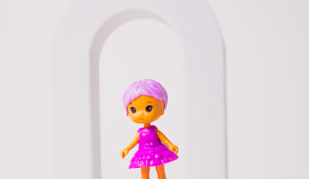 A cute toy doll with short hair and a shiny pink dress is positioned playfully in front of a soft white archway. This cheerful scene invites imagination and fun.