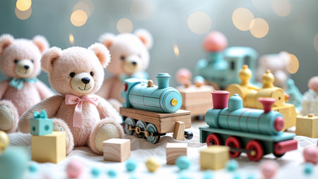 Colorful toys and teddy bears create a joyful playtime atmosphere in a cozy room filled with soft lights