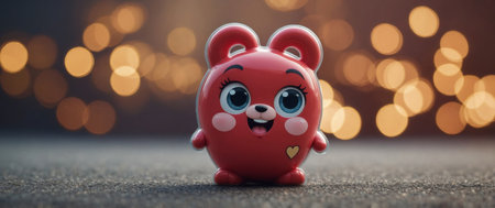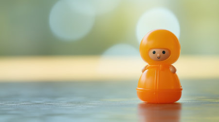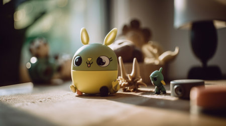 A small, colorful robot toy stands on a table, its blue and colorful body illuminated by warm light. The background is blurred, creating a sense of depth and highlighting the toy.