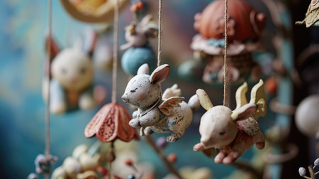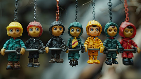 Colorful Toy Figurines Hanging on Chains Outdoors