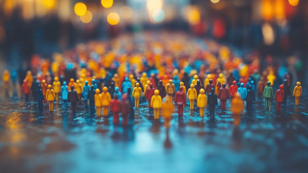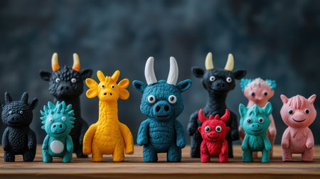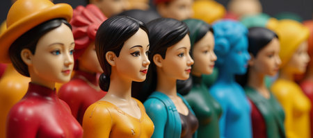 A joyful arrangement of colorful toy figures in a precise lineup, each representing individuality yet united in purpose, ideal for conveying themes of diversity and unity, banner