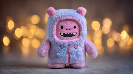 A charming plush toy featuring a smiling face, dressed in a cozy hoodie. The soft pastel colors blend beautifully with the warm blurred lights background. Perfect for gifting or as a decorative piece.