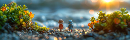 Two small figures, wearing hats and coats, stand on a rocky beach at sunset. The figures are facing the water, looking out towards the horizon. The water is blurred in the background, and the sun is setting behind them, creating a warm glow. There are plants and flowers in the foreground, adding color and texture to the scene.