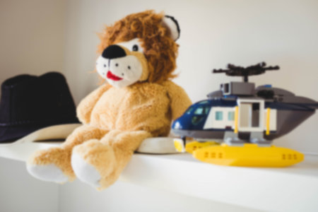 Assortment of colorful toys for kids room decor and playtime displayed on a desk