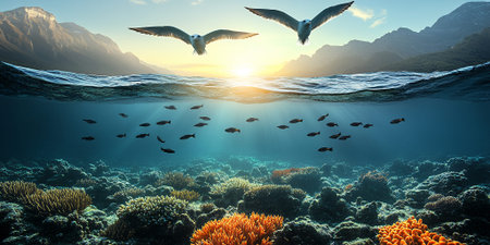 Stunning Ocean Sunset Scene with Birds and Reef Fish sea sky art view rays blue calm coral