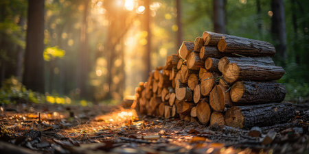 Sunlight filters through trees, illuminating freshly cut logs arranged on the forest floor.