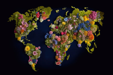 Flower Map, a World Map Made of Flowers on Dark Background, Abstract Generative AI Illustration