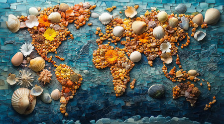Vivid world map crafted from natural marine elements offers an artistic interpretation of geography. Shells, flowers, and sea plants form continents, blending nature with art.
