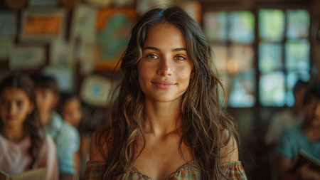 A close-up portrait of a young girl with long, dark hair and freckles. She is wearing a colorful shirt and has a warm, inviting expression on her face. She is looking off-camera with a subtle smile. The background is blurred and out of focus, giving the image a soft and dreamy quality.