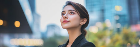 Young businesswoman reflecting on her successful innovation journey in a vibrant cityscape.