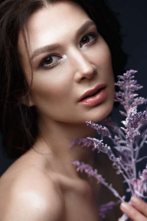 Beautiful woman with a light natural make-up and perfect skin with flowers in her hand. Beauty face. Picture taken in the studio on a black background.