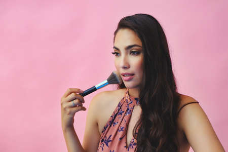 young adult latin beauty woman with makeup brush on studio background