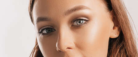 Beautiful face on white banner background. Perfect woman portrait