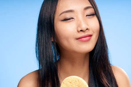 Face care, sponge, asian, girl on a blue background, girl with a sponge.