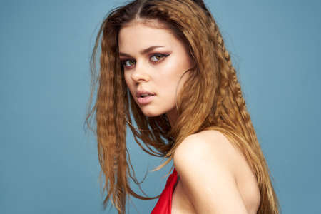 Woman with wavy hair attractive look Red tank top blue background