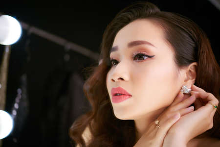 Headshot of beautiful Vietnamese woman sitting at dressing table and putting on earrings while preparing for party in night club