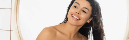 smiling young african american woman with wet hair looking in mirror in bathroom, banner