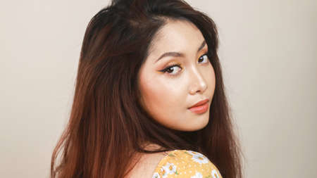Adult young woman serious long hair portrait in studio
