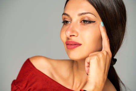 Young woman tightening her face skin with her fingers on a gray background
