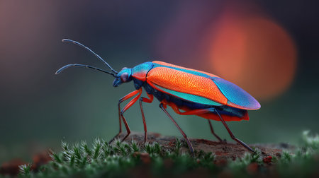 This macro shot reveals a stunning insect with vivid blue and orange colors, elegantly perched on a mossy surface, highlighting the intricate details of nature's beauty.
