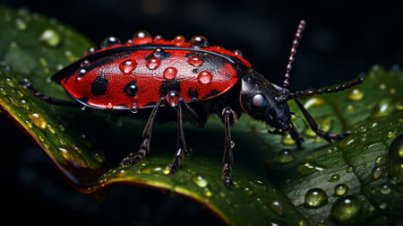 A close-up view of a vibrant insect resting on a leaf, showcasing stunning colors and water droplets, highlighting the intricate details and beauty of nature.