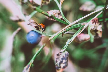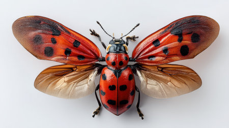 Close-up view of a vibrant red and black ladybug with transparent wings. This macro photograph showcases the intricate details and patterns, highlighting the beauty of nature. Perfect for educational and artistic projects.