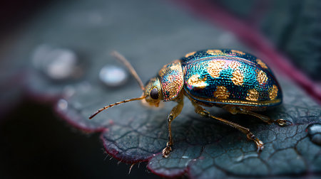 Close-up of an iridescent beetle on a leaf, surrounded by dew drops, capturing the natural beauty and vibrant colors of the insect in a serene setting.