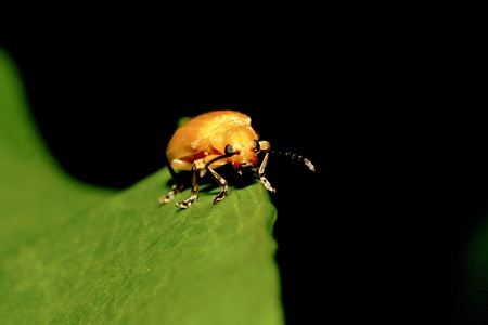 A stunning close-up of an orange beetle perched on a green leaf adorned with glistening dew drops, showcasing the beauty of nature in detail.