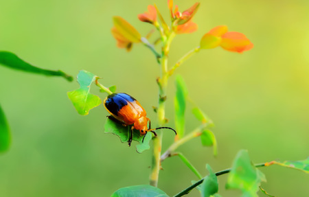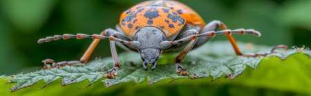 A detailed image showcases a beetle resting on a vibrant green leaf. The insect displays intricate patterns and a mix of colors against a blurred dark background. The scene, likely set outdoors, highlights natural textures. This image is suitable for various commercial uses, including editorial and design projects.